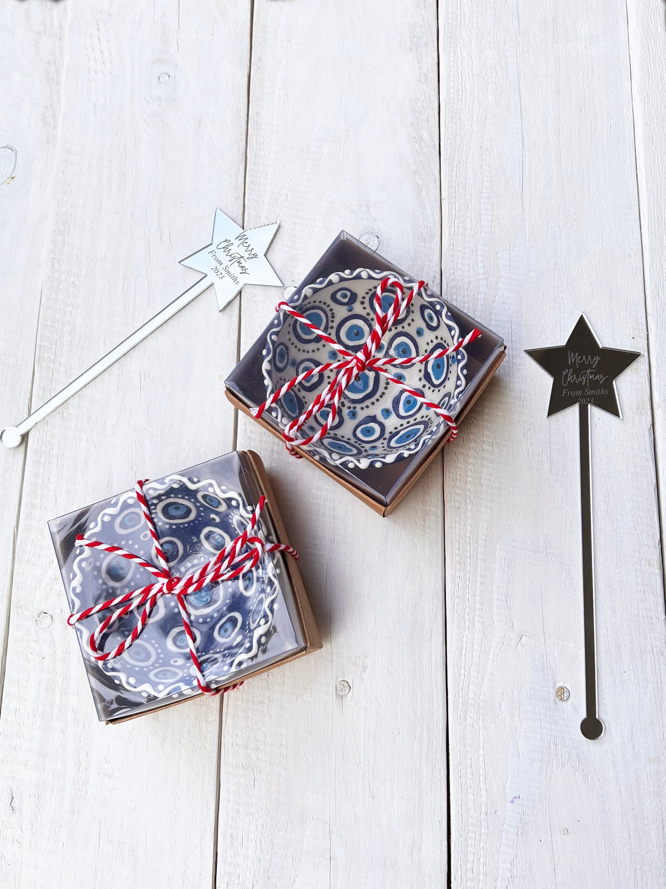 Unique Holiday Gifts: Handmade Ceramic Evil Eye Bowls with Customizable Tags!